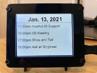 All of the files required for this project (the code, graphics, fonts and audio files) are available for download on GitHub. There are four code files for this project, our regular code.py along with secrets.py, calendar.py and openweather_graphics.py.