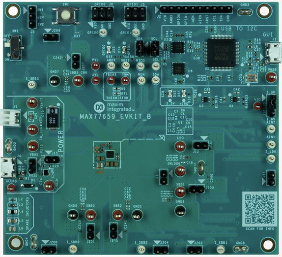 The MAX77659EVKIT# evaluation kit (EV kit) allows for easy experimentation with various MAX77659 features, including a switching charger, a SIMO buck-boost regulator with three buck-boost outputs, a linear regulator, on/off controller, and I2C interface. Windows®-based software provides a user-friendly graphical interface and a detailed register-based interface to exercise the features of the MAX77659.