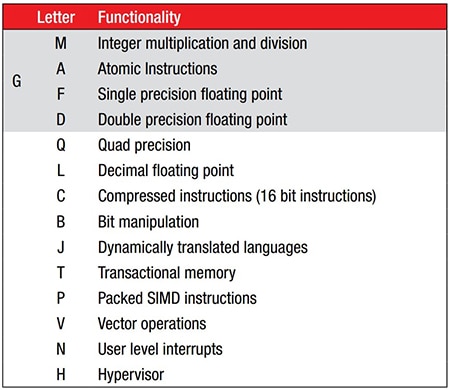 Pour de nombreuses applications d'intelligence artificielle (IA) et d'apprentissage automatique (ML), ainsi que pour les systèmes embarqués avancés, les quatre extensions indispensables sont la multiplication et la division de nombres entiers (M), les instructions atomiques (A), la virgule flottante simple prévision (F) et la virgule flottante double précision (D). Cependant, au lieu de désigner un cœur sous le nom RV32MAFD, toutes ces extensions sont regroupées sous le suffixe G, comme dans RV32G.