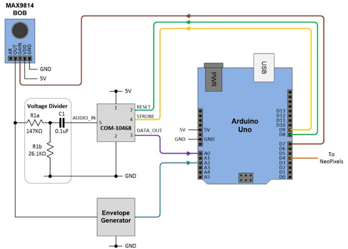 Figure 7: In addition to the COM-10468 audio tone processor, the enhanced Audio-Reactive Artifact employs a MAX9814 electret microphone BOB and an envelope generator. (Image source: Max Maxfield)