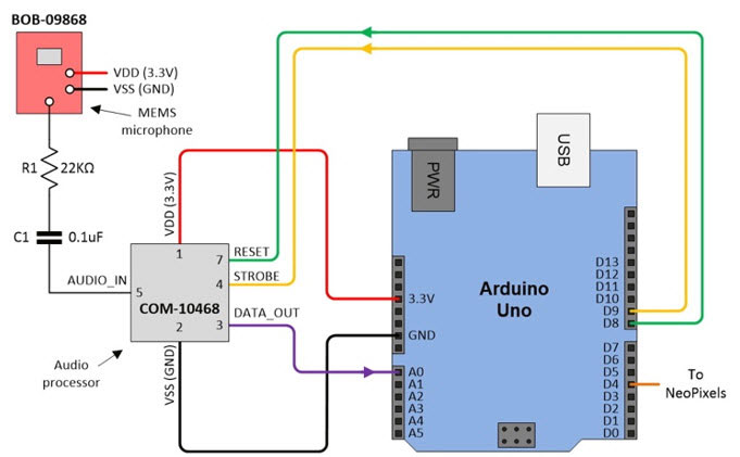 As discussed in my original blog, the initial incarnation of the project is powered by an Arduino A000066 Uno R3 development platform for the ATMEGA328P microcontroller from Microchip Technology. Since the point of the exercise is for the system to respond to sound, I also used a microelectromechanical systems (MEMS) microphone breakout board (BOB). Specifically, the BOB-09868 from SparkFun Electronics.