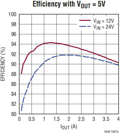 Le dispositif LTC3649 de Analog Devices est un régulateur abaisseur synchrone monolithique, 4 A, 60 V, à haut rendement. Ce régulateur présente une tension de sortie programmable par une seule résistance, une compensation interne et un haut rendement sur une plage VOUT étendue.