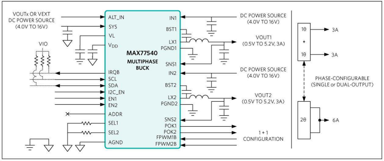Le dispositif MAX77540 de Analog Devices est un convertisseur abaisseur à haut rendement avec deux phases de commutation de 3 A. Il utilise une architecture de contrôle en mode courant COT (à temps constant) adaptatif, et les deux phases de commutation de 3 A peuvent être configurées comme une sortie (2Φ, 6 A) ou deux sorties (1Φ, 3 A chacune). Sa large plage de tensions d'entrée permet une conversion directe pour les sorties inférieures à 1 V à partir de batteries Li+ à 3 cellules, d'USB PD et des rails d'alimentation de 12 VCC. Les tensions de sortie sont préréglées avec des résistances et peuvent en outre être réglées via une interface compatible I2C. Avec un rendement de pointe de 94 %, un faible courant de repos et un format de solution compact, le MAX77540 est idéal pour les équipements alimentés par batterie et soumis à des contraintes d'espace.