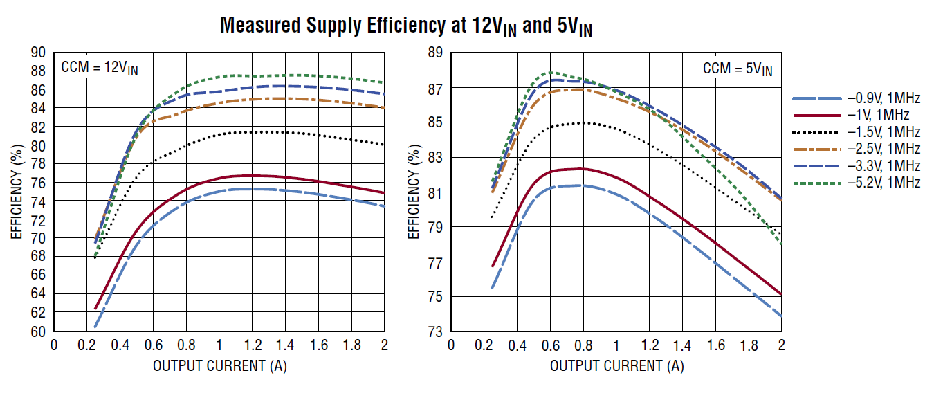 >85%, 5V in, -5.2V @ 0.4 ~ 1.3 A >85%, 5V in, -3.3V @ 0.4 ~ 1.4 A >84%, 12V in, -3.3V @ 0.6 ~ 2 A >79%, 5V in, -0.9V @ 0.4 ~ 1.3 A >74%, 12V in, -0.9V @ 0.8 ~ 1.8 A |