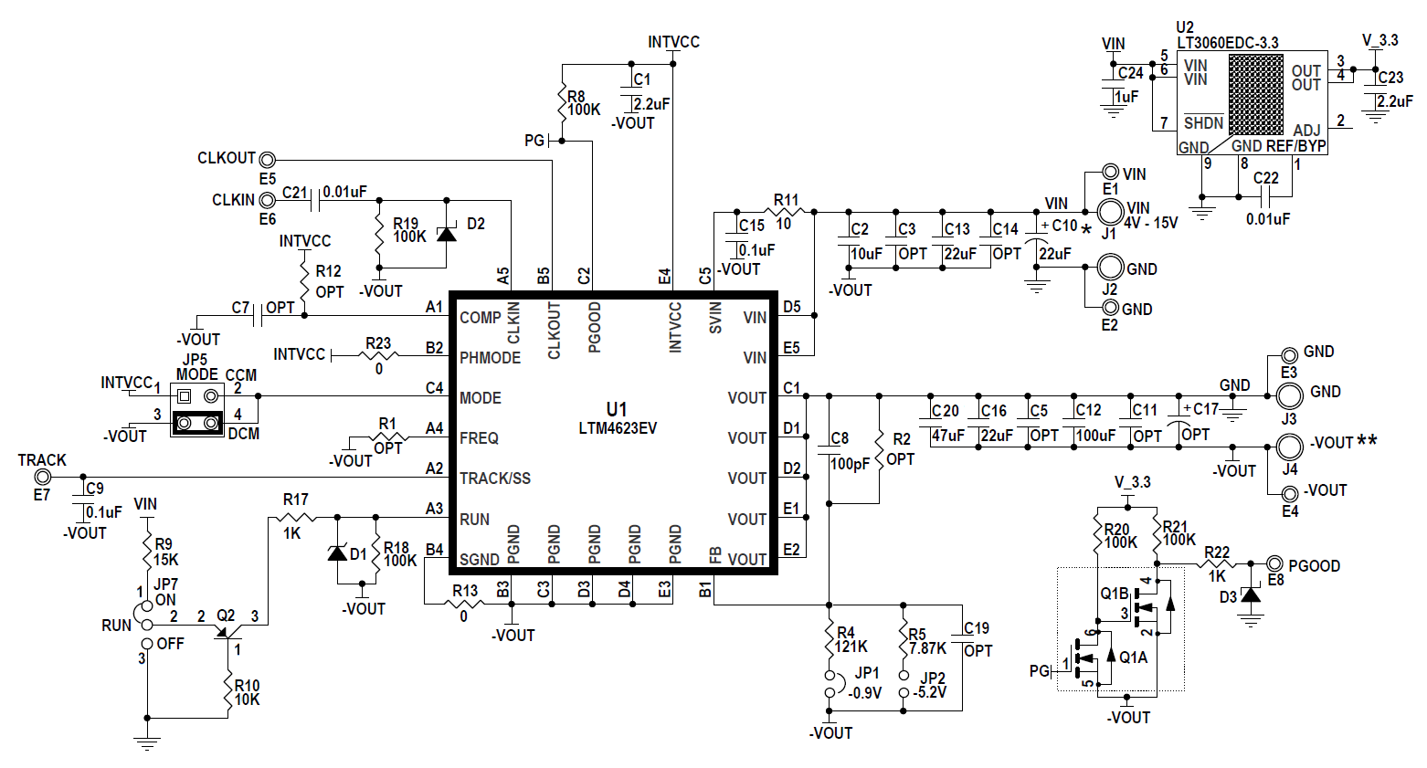 Demonstration circuit 2721A-A features the LTM4623 µModule regulator, a tiny high performance high efficiency step-down regulator configured as an inverting buck-boost regulator. The DC2721A-A has an operating input voltage range of 4V to 15V and is able to provide an output current of up to 2A. The output voltage can be programmed between -0.6V and -5.5V. The LTM4623 is a complete DC/DC point of load regulator in a thermally enhanced 6.25mm × 6.25mm × 1.82mm LGA package requiring only a few input and output capacitors.