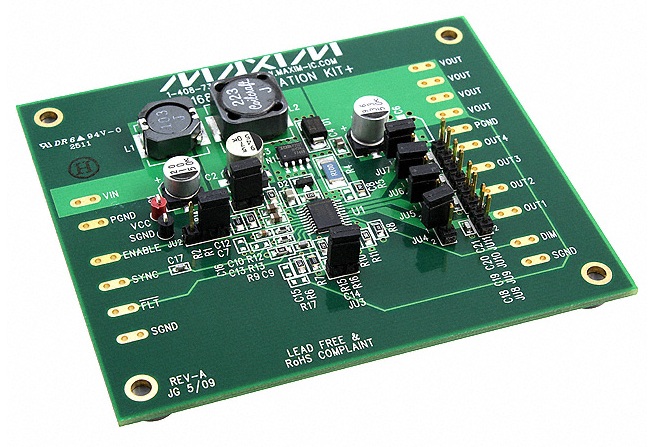 The EV kit operates from a DC supply voltage of 6.5 V up to the HB LED string forward voltage. The EV kit can withstand a 40 V load-dump condition. The EV kit also demonstrates the IC features such as adaptive voltage optimization, undervoltage lockout (UVLO), overvoltage protection (OVP), cycle-by-cycle current limit, thermal shutdown, and digital PWM dimming operation using a digital PWM input signal to control the brightness of the HB LEDs. The EV kit also demonstrates a reference IC design for automotive applications.