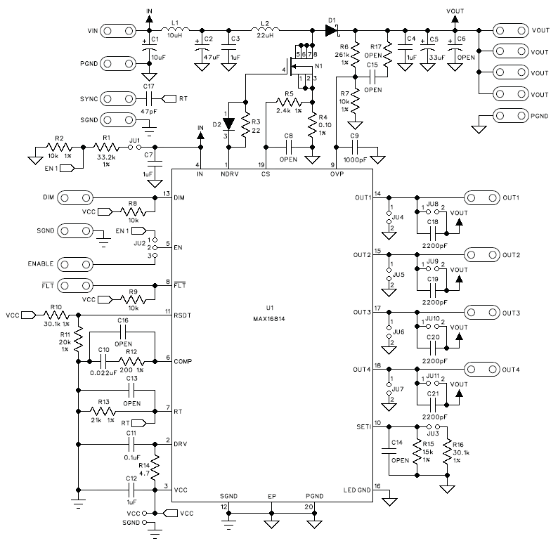 The MAX16814 evaluation kit (EV kit) demonstrates the MAX16814 high-brightness LED (HB LED) driver, integrating a step-up DC-DC pre-regulator followed by 4 channels of linear current sinks. The step-up pre-regulator switches at 350 kHz and operates as a current-mode controlled regulator capable of providing up to 600 mA for the linear circuits. Each of the 4 linear channels can operate up to 40 V and provide up to 150 mA per channel. The 4 channels are configurable for 100 mA or 150 mA HB LED output current. The IC is a 20-pin TSSOP package with an exposed pad for enhanced thermal power dissipation.