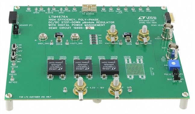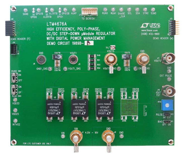 Demonstration circuit 1989B-B is a high efficiency, high density, µModule regulator with 4.5V to 17V input range. The output voltage is adjustable from 0.5V to 4V, and it can supply 75A maximum load current. The demo board has three LTM®4676A µModule regulators, and the LTM4676A is a dual 13A or single 26A step-down regulator with PMBus power system management. Please see LTM4676A datasheet for more detailed information.