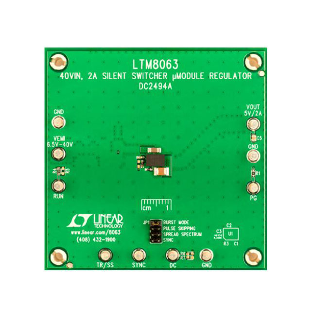Demonstration circuit 2494A is a 40V, 2A step-down µModule® regulator featuring the LTM®8063. The demo board is designed for 5V output from a 6.5V to 40V input. The wide input range allows a variety of input sources, such as automotive batteries and industrial supplies. The user adjustable features of the LTM8063 such as output voltage, switching frequency, soft-start, and power good can be changed on DC2494A simply by modifying the appropriate resistors and/or capacitors.