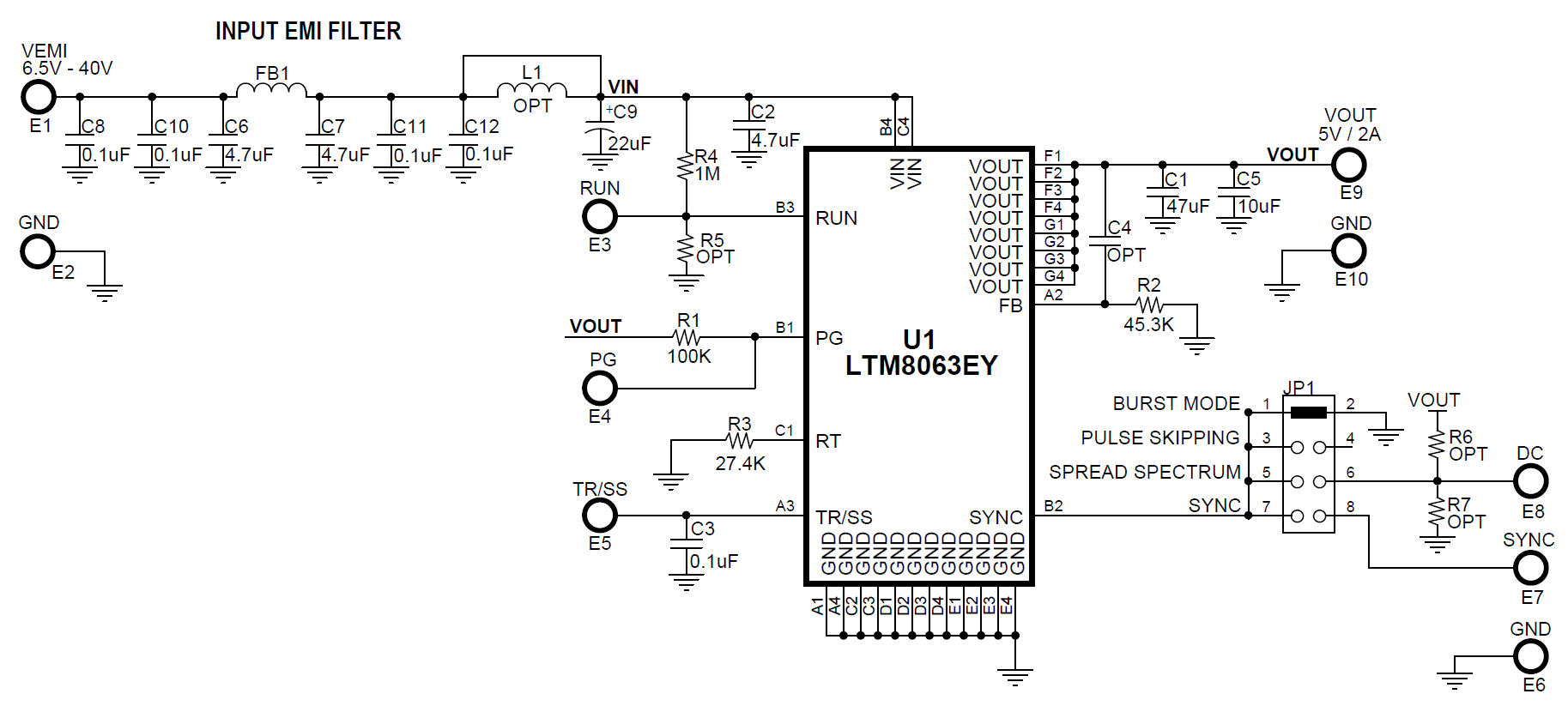 The LTM8063 can be programmed to different operation modes. The SYNC pin on the demo board is grounded by default for low ripple Burst Mode® operation. Moving JP1 to PULSE SKIPPING position changes the operation mode to pulse-skipping operation. To synchronous to an external clock, move JP1 to SYNC and apply the external clock to the SYNC turret. Once JP1 is on SPREAD SPECTRUM position, an external DC source can be applied to the SYNC pin to enable low EMI spread spectrum operation. This DC source can also be generated from Vout with appropriate voltage divider if VOUT is 2.9V or higher. See the Quick Start Procedure section for more details.