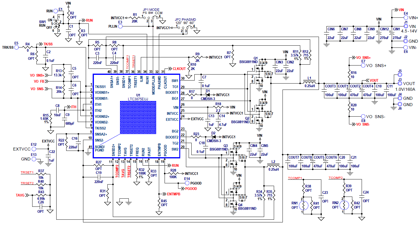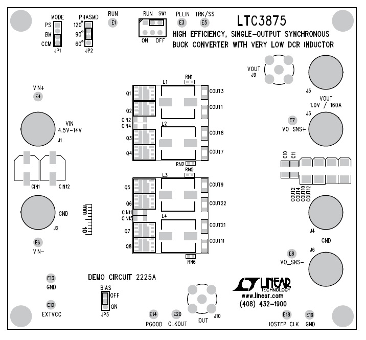 Demonstration circuit 2225A is a high efficiency, high density, 4-phase synchronous buck converter with a 4.5V to 14V input voltage range. It can supply up to 160A of load current with a 1.0V output. This demo board has two each LTC®3875EUJ feature-rich dual phase current mode synchronous buck controllers with very low DCR current sensing capability, on-chip drivers and remote output voltage sensing.