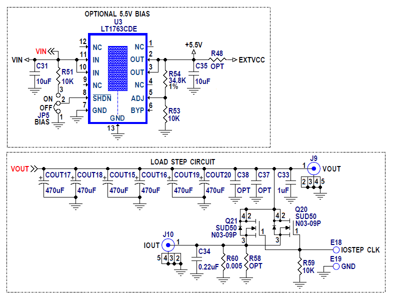 This board is set up with 0.32mΩ DCR output inductors. The temperature compensation function offers an option for accurate current limit over a wide temperature range with DCR sensing. To shut down the converter, set the RUN pin voltage below 1V (SW1: OFF).Use JP1 jumper to select Burst Mode® operation, pulse skipping mode or forced continuous mode operation at light load. Switching frequency is preset at about 400kHz, and it can be easily modified from 250kHz to 720kHz. An on-board dynamic circuit is also available for transient test.