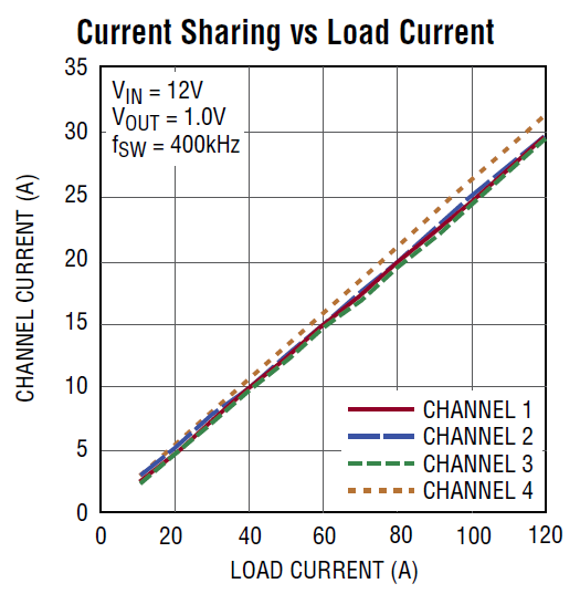 Demonstration circuit 2055A is a high efficiency, high density, 4-phase synchronous buck converter with a 4.5V to 14V input voltage range. It can supply up to 120A of load current with a 1.0V output. This demo board has two each LTC®3875EUJ feature-rich dual-phase synchronous current mode buck controllers with very low DCR current sensing capability, on-chip drivers and remote output voltage sensing. This board is set up with 0.32mΩ DCR output inductors. The temperature compensation function can guarantee accurate current limit over a wide temperature range with DCR sensing.