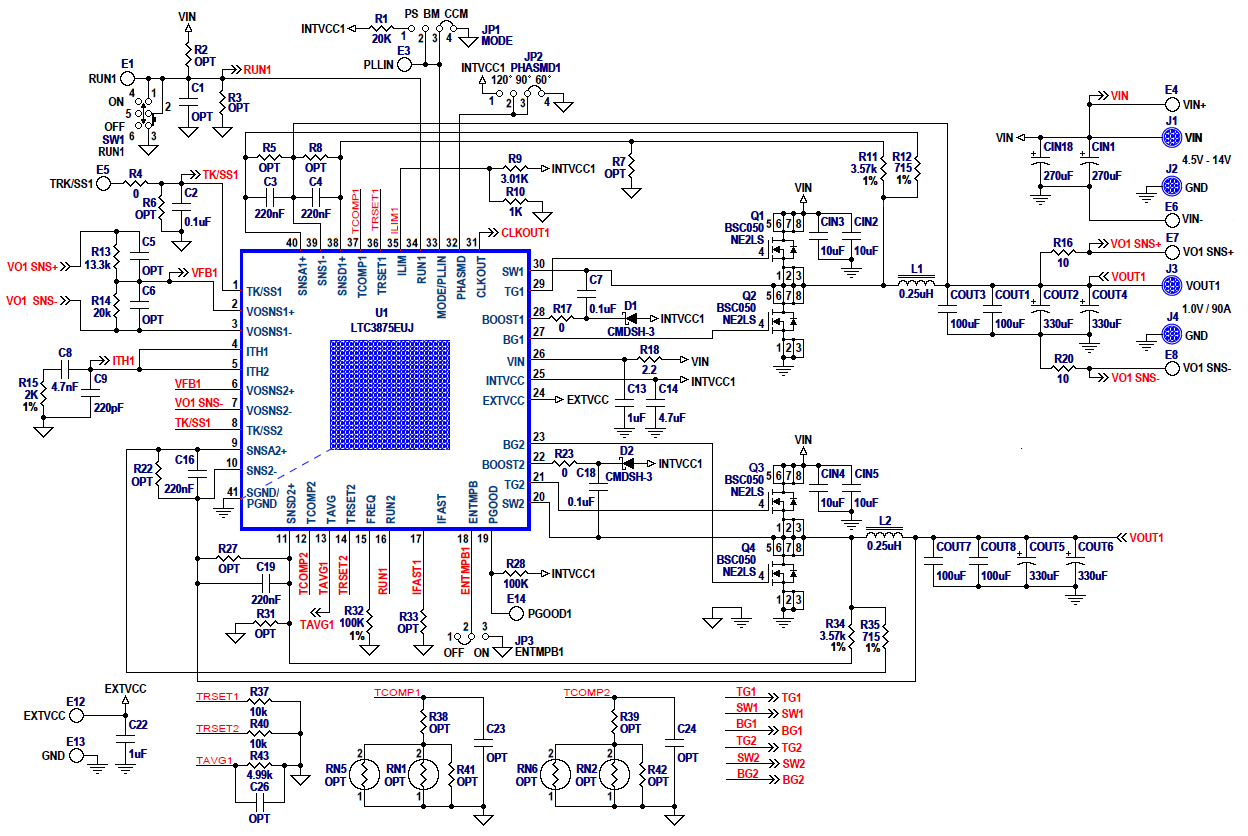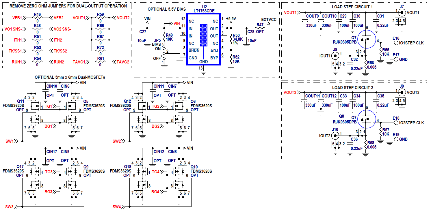 To shut down the converter, set the RUN pin voltage below 1.0V (SW1 and SW2: both OFF). Use JP1 jumper to select Burst Mode® operation, pulse-skipping mode or forced continuous mode operation at light load. The switching frequency is pre-set at about 400kHz, and it can be easily modified from 250kHz to 720kHz. An onboard dynamic circuit is also available for a load transient test. Please see LTC3875 data sheet for more detailed information.